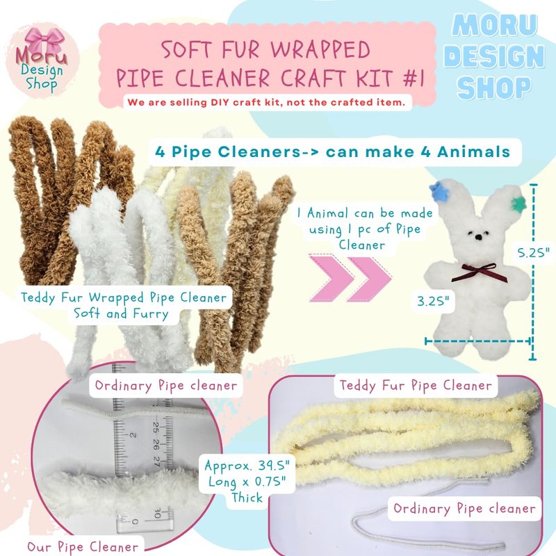 - Fur wrapped pipe cleaner : Introducing the 39.5-inch long and 0.75-inch wide teddy fur-wrapped pipe cleaner. This soft and plush material takes your crafting experience to the next level, making it to create charming small animals. Simply follow our step-by-step tutorial page to craft adorable bears, dogs, and bunnies. 1 pc of pipe cleaners can be turned into 4 small animals sized about 4-5" L x 3-4" W. No cutting, sewing is needed. Simply bend the wire and shape it.