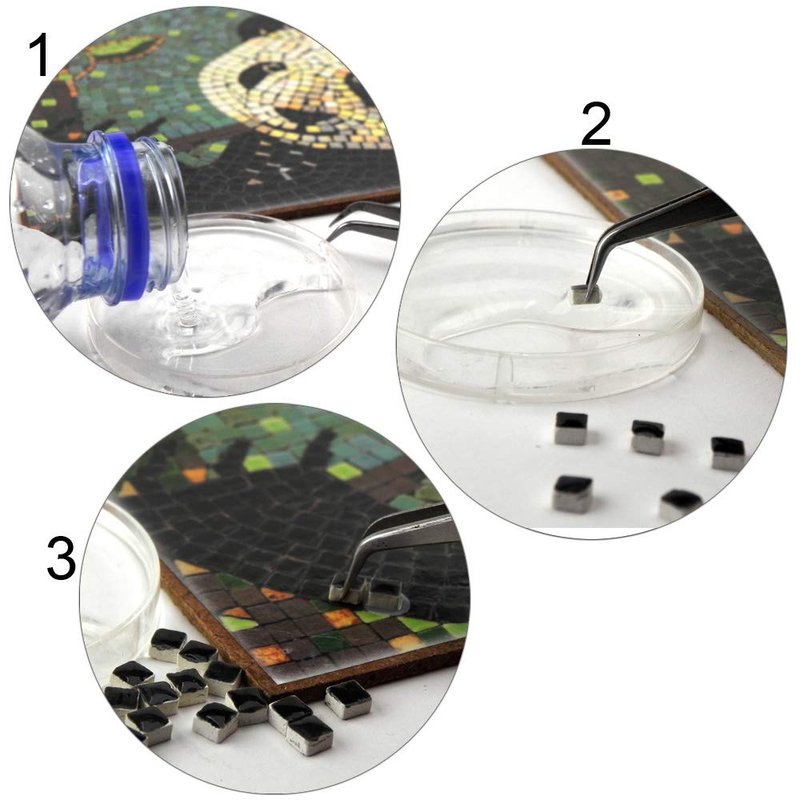 mosaic with true material that will be appreciated for many years, no plasticsexpress your creativity and make your own mosaic. with square elements, real ceramic micro tiles 1/8 wide (5x5 mm), a size which the Romans used quite often. The stones are actually molded, glazed and fired as tiny as you see them. The glaze arches upward during the fire, being liquid. It solidifies. This capillary action everybody knows of water. The small domes reflect the light in all directions..can be the perfect gift, Birthday, Wedding ,Anniversary ,gift ideasEasy kind of reverse puzzlePretty fast thanks to the ingenuity of our new magic material. Just dip a stonein water and put it in its place. Continue stone by stone.Wait, and the tessellate are firmly in place.Your art work is fished easily.Contents:- ceramic micro tiles - magic wooden base - instructionsMosaic size:-seven inch Square or twenty cmMaterial:Clay, pottery clay, glazed, fired at 1060 degrees Celsius (1940 degrees Fahrenheit)Not a Toy, from 14 years and up.