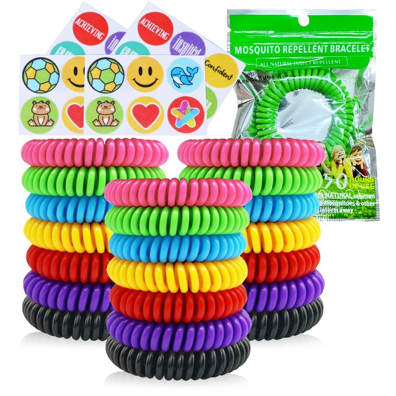 - 21 repellent bracelets (red*3, pink*3, blue*3, black*3, green*3, yellow*3, purple*3) - 21 resealable bag - 24 repellent stickers NOTE: If opened, please use it as soon as possible. If not in use temporarily, please put it back in the bag and seal it properly.