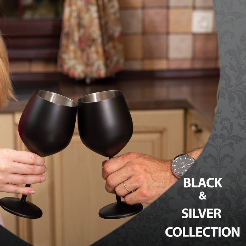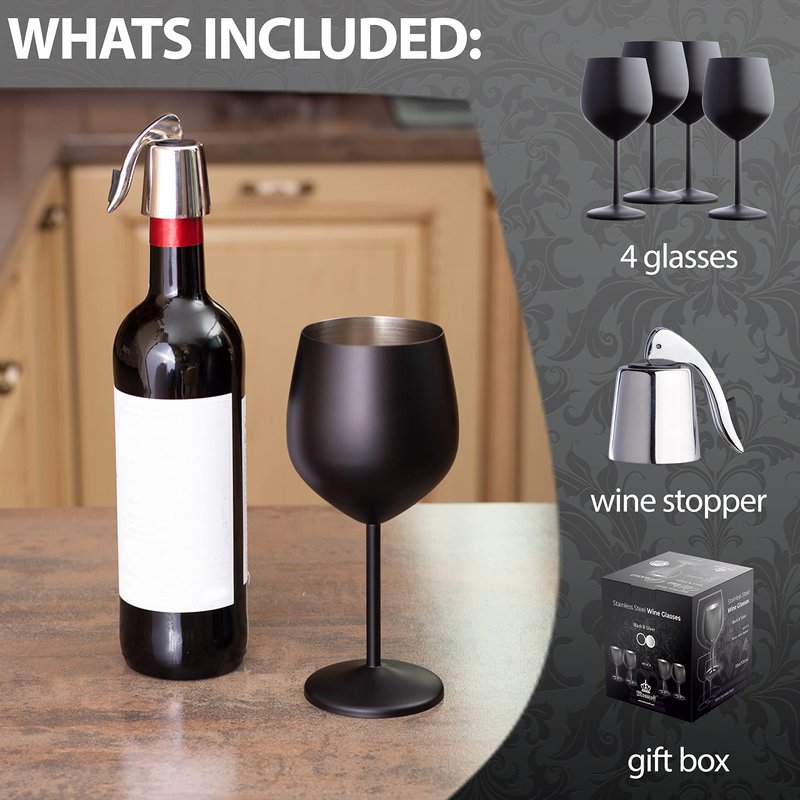 Mosscoff Stainless Steel Wine Glass Set of 4 - Black and Silver collection - 18 oz/530 ml Unbreakable Wine Glasses with a wine stopper - Portable Metal Wine Glass