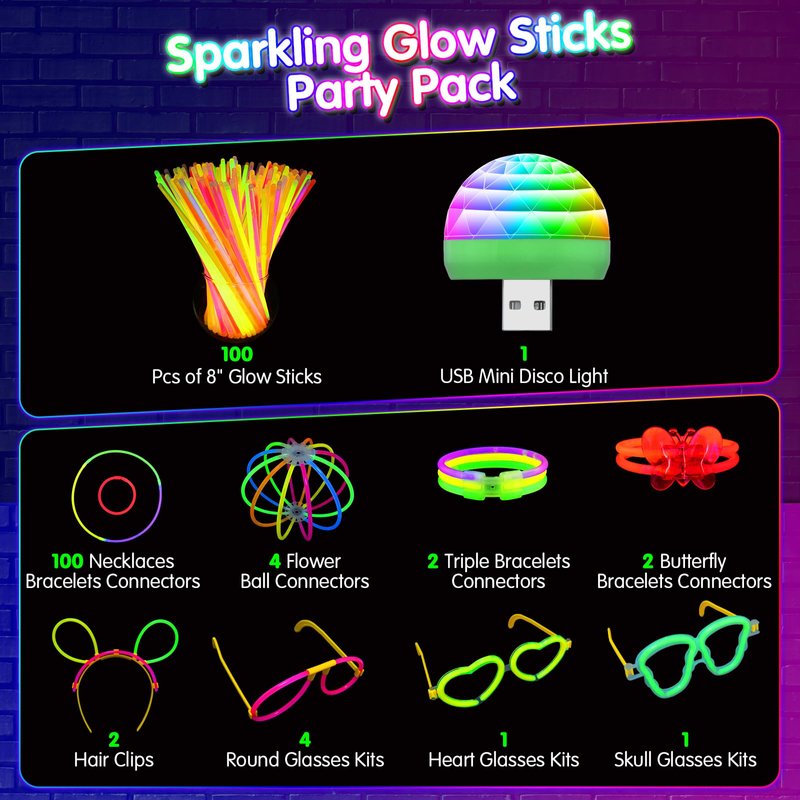- 【229pcs Great Value Glowing Party Favors】Our neon glow sticks provide various neon accessories, including party glow sticks, USB mini disco light, bracelets, necklaces, round glasses, heart glasses, skull glasses, flower, ball, triple bracelets and butterfly bracelets. You can DIY any shape you want. And with the decoration of the magic strobe light, your party will be more lively.