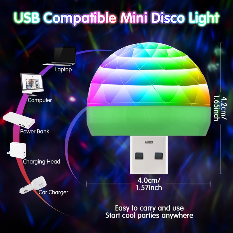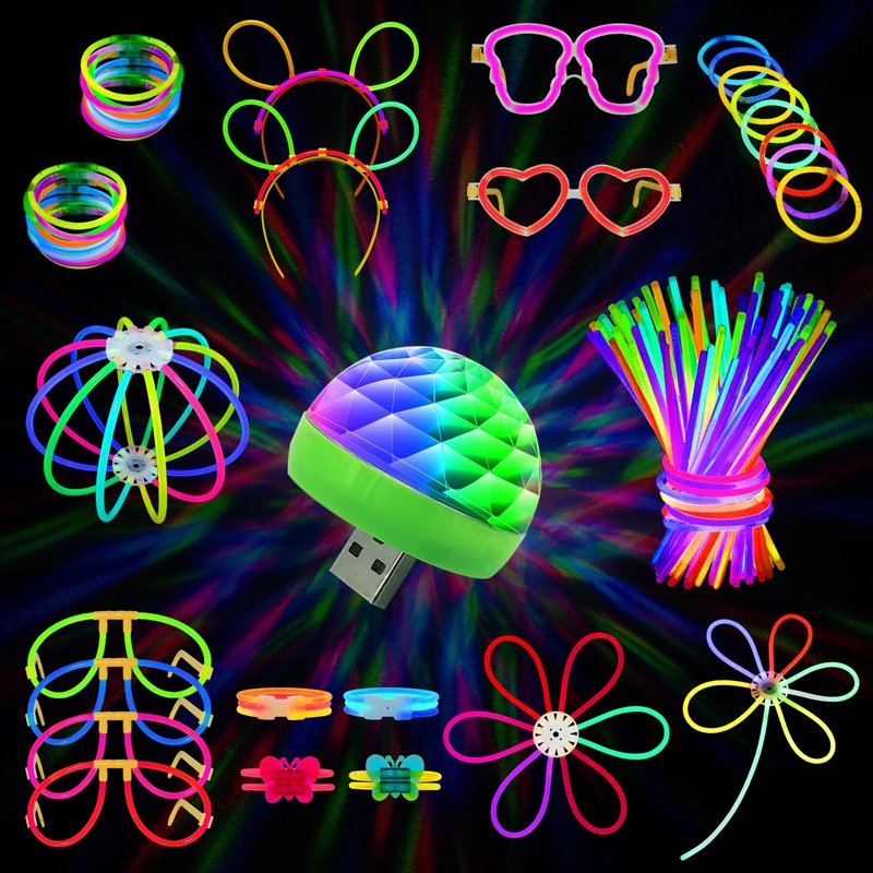 - 【Newly Eye-catching Accessory】MOSSNDAR glow sticks party pack newly added USB mini disco light. It can be applied on computer, power bank, car charger, charging head and other objects with USB interfaces. It adopts sound activated design which can change strobe lights color and speed with the music, providing you with colorful visual effect and disco atmosphere.