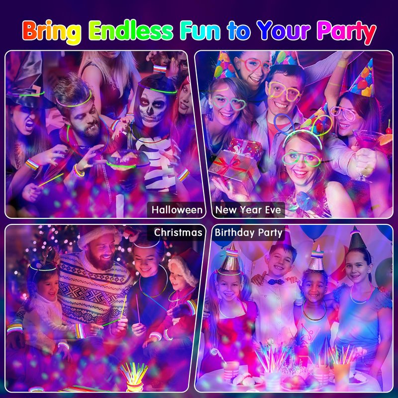 Colorful Glow Sticks can make glow bracelets, glow necklaces. Add fun for your party with friends. Give your a best glow party. Perfectly decorate your head, hair, face, hands, fingers, clothes. Making you stand out of the dark in glow parties. Super cool and super fun!Our glowsticks comes with various of modes and connectors, easy to make glow glasses, glow necklaces and bracelets, glow headbands, balls, flowers. Just use your imagination to create more glow party decorations and accessories. Both kids and adults can have fun with these party glow sticks and LED light up party accessories. Suitable for all kinds of glow parties, such as glow halloween party favors, christmas & new years glow party supplies, glow in the dark birthday party supplies, disco party supplies, dance party favors, kids party supplies etc. Also perfect for night activities, double as fun camping accessories for kids, rave light up accessories, wedding dance floor props etc.