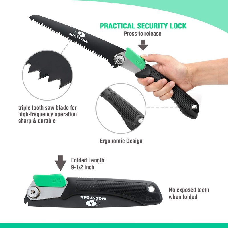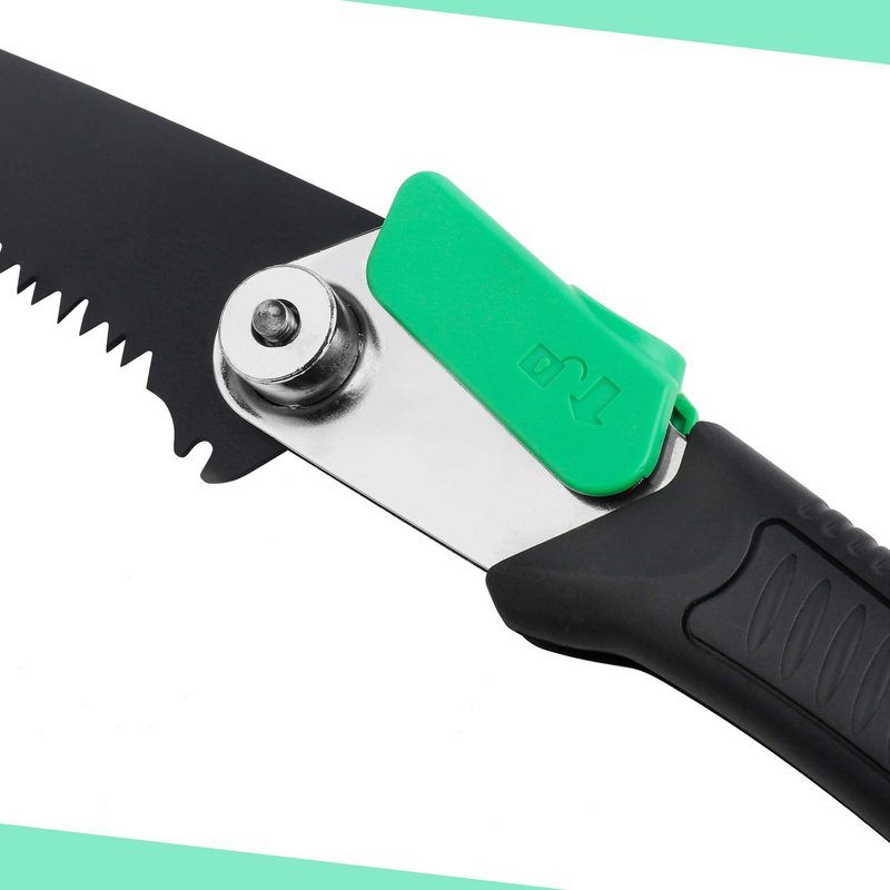 - SECURE LOCK - Tighten the black knob during use to prevent the blade upward or remove. Lock System prevents the blade from accidental close during use. Push the green button and fold the saw blade, store it in your pocket when it's idle. Before putting into use, take the folding saw out from the sheath, open and stretch the saw blade and lock it