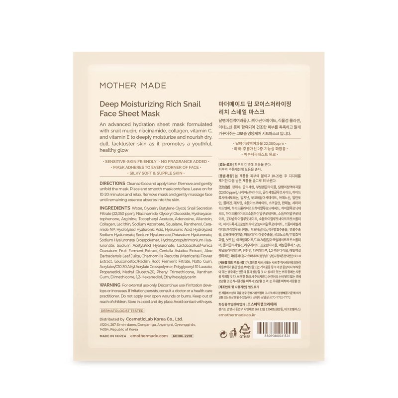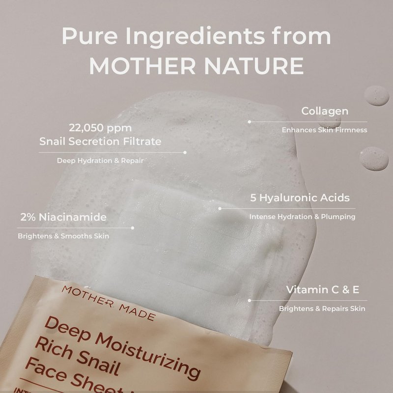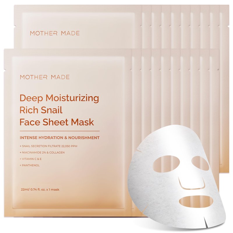 MOTHER MADE Deep Moisturizing Rich Snail Treatment, set of 20, is an anti-aging korean skin care face sheet treatment for firming, lifting, and smoothing fine lines and wrinkles. Snail facial treatment contains 22,050 ppm of snail secretion filtrate, called snail mucin, that boosts collagen production, deeply moisturizes, revitalizes, regenerates the aged, dry, dehydrated skin. This snail face mask makes skin supple, plump, and glowing facial complexion. This age rewind face treatment is suitable for men and women, teens, good for gifts for mom, dad, daughters. It contains niacinamide, Vitamin C, Vitamin E, Hyaluronic Acid, Ceramides, Collagen, Allantoin, Aloe Vera, Holy Grail for Intense Hydration Skin Therapy This rich yet lightweight deep moisturizing face mask combines all the antioxidants your skin craves along with natural moisturizers such as ceramides, allantoin hyaluronic acid, creating the best skincare rituals that instantly moisturizes, nourishes, and conditions. Friendly for all skin types, best for dry/sensitive/oily/melasma. Great for Both Men and Women Texture: Lightweight, oil-free rich serum. Scent: clean, unscented A cocktail of natural moisturizers and antiaging antioxidants -Snail Secretion Filtrate: snail mucin is packed with water, minerals, vitamins, and nutrients absorbed into the skin quickly -Marine Collagen: Sourced from fish, it helps boost skin's natural collagen production, lift and tighten sagging skin -Hyaluronic Acid: A natural hydrator known for its incredible moisture-retaining properties -Vitamin C & E: Nourishing antioxidants that prevent skin aging and help reduce the appearance of aging by reducing fine lines and wrinkles. Great to use at night (overnight) for the best makeup the next morning. Best result after exfoliating or peel off dull, rough skin