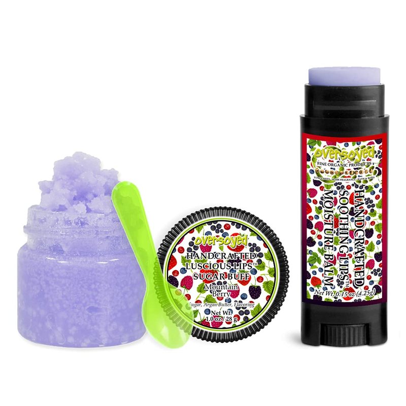 Mountain Berry Soothing & Luscious Lips by OverSoyed Exfoliator & Chapped Lip Repair Lip Care Combo | Artisan Handcrafted to Order Fruity Berries Strawberry Blackberry Raspberry Flavored Exfoliating Sugar Lip Scrub & Lip Moisturizer Balm Gift Set
