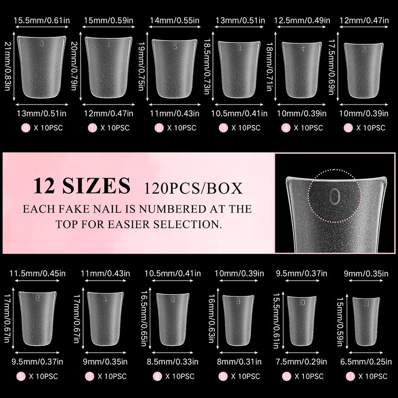 - đ ăVarious SizesăDuck nail tips contain 12 sizes, with 10 nails in various sizes, 120 in total per box; the nail tips are clearly numbered at the top, making it easy to quickly select the right one for you, saving you a lot of time in choosing.
