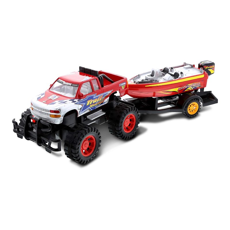 - INCLUDED WITH THE PURCHASE OF LARGE MONSTER TRUCK TOY SET - Includes 1 Mozlly Monster Truck Toy and Trailer with Speed Boat Set. A perfect toy truck with boat trailer to engage in an imaginative play of driving a real trucks with trailer and boat. This red monster truck pack with toy boat trailer requires no batteries, just a simple push and go toys to enjoy with friends. The kids toy boat and truck trailer set measures 9Lx6.5Wx6H inches.