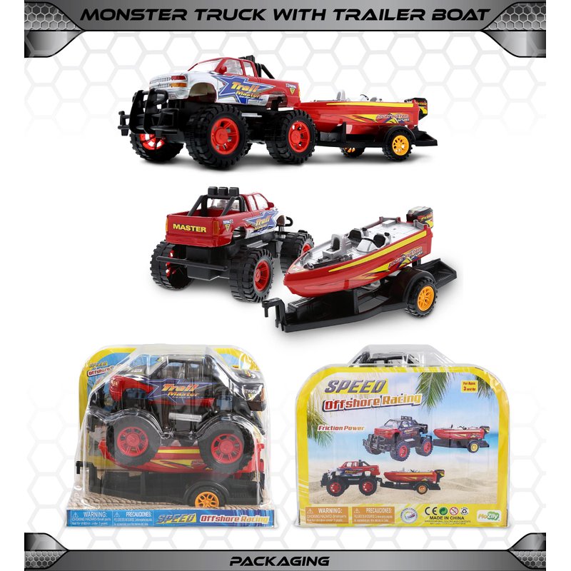 - THE MONSTER TRUCK AND TRAILER TOYS FOR BOYS COMES WITH EXCITING DESIGN YOU WILL LOVE - Ignite your kid's imagination with the monster truck with trailer toy speed boat. The friction-powered mechanism allows the truck trailer toy to be easily pushed and pulled. The kids monster truck toys come with a detachable trailer with boat, adding an extra layer of adventure. Have them experience pure fun as they play with the toy truck and trailer set.