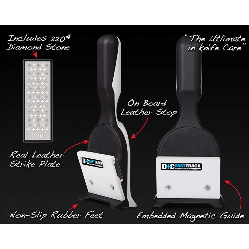 MPOWER FASTTRACK Kitchen Knife Sharpener uniquely creates and maintains full bevel edges on knives, finishing the edge using the “on-board” real Leather Honing Strop - all with no set-up required. Unlike many popular "single point contact" sharpeners, the FASTTRACK Kitchen Knife Sharpener is actually good for your knives. Rather than a single point, the Sharpener has a large surface contact area between the diamond stone and knife, which creates accurate bevels that culminate in a fine blade edge. From the research and feedback MPOWER received they decided that a sharpening angle of 17° (or an inclusive angle of 34°) would offer the best all round performance for work in the kitchen. Subsequent re-sharpening is fast, as the existing bevel is met at the same point and at the same angle as the last sharpening, extending the life of the edge and ultimately the life of the knife. The Sharpener's twin Rare Earth Magnets hold the blade at the correct sharpening angle, while the inset leather strike plate protects the knife sides from scratching. The magnets are also used to hold the Diamond Stone in place, which means they can be changed in seconds. Diamond Stones can be mounted in 4 different positions to maximize stone life. The balanced ergonomic design, as well as oil resistant Nitrile Feet for gripping the work surfaces, makes the FASTTRACK Kitchen Knife Sharpener natural and easy to use. The Sharpener includes a 220 Grit Diamond Cross Stone as standard. This stone is interchangeable with those used on MPOWER’s FASTTRACK Chisel Sharpener, so these other grits (Extra Coarse 100, Finishing 450, Fine 600, and Super Fine 1000) may also be used on this unit if an even more refined edge desired. Both the Sharpener and the Diamond Stone are guaranteed for 3 years.