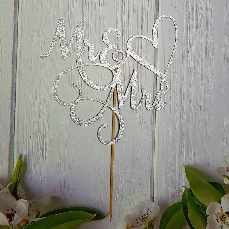 Mr and Mrs Cake Topper, Bride and Groom Sign Wedding, Engagement Cake Toppers Decorations, Double-faced Silver Glitter