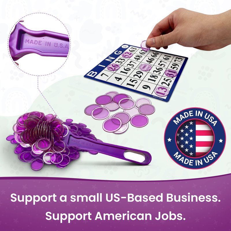MR CHIPS Made in USA Bingo Magnetic Wand & ¾ Inch Purple Plastic Chips with Metal Rings - 100 Upgraded Pieces Bingo Chips Magnetic, Support American Jobs
