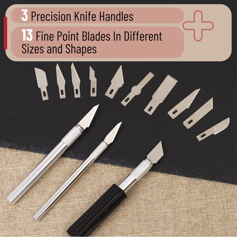 - Includes: 3 x Precision Knife Handle + 13 Fine Point Blades In Different Size and Shapes For Exact Cuts