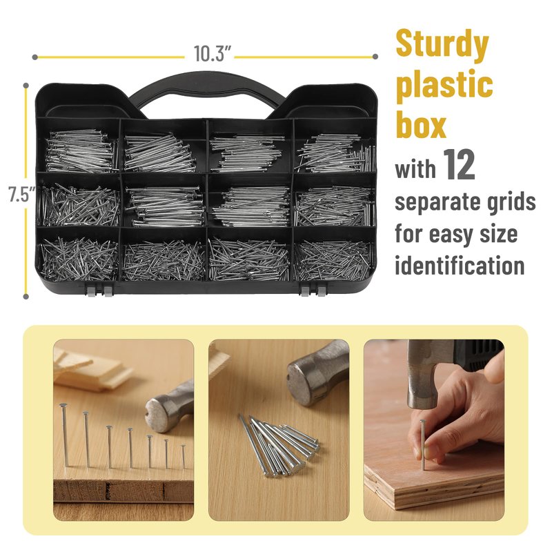 - The 1500 pieces of nails are organized into a sturdy plastic box with 12 separate grids for easy size identification.