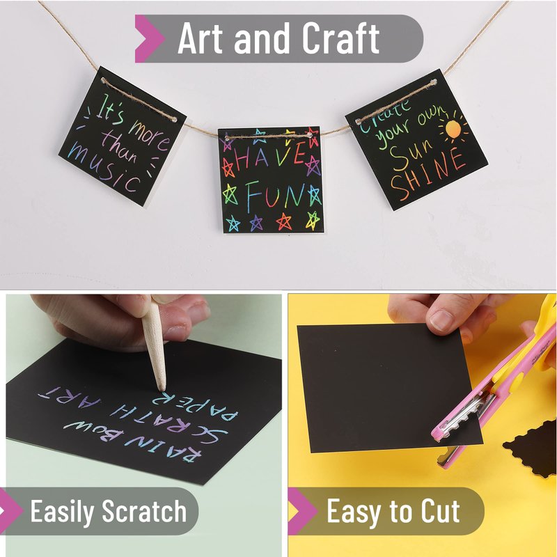 - Our scratch art notes come in a package of 125 sheets and feature bright, vivid colors that can be revealed with a simple scratch. Each sheet is 3.45" x 3.45" in size and has a matte coating that hides the vibrant colors beneath.