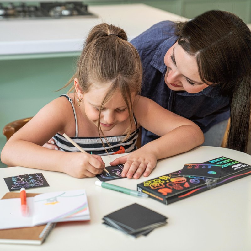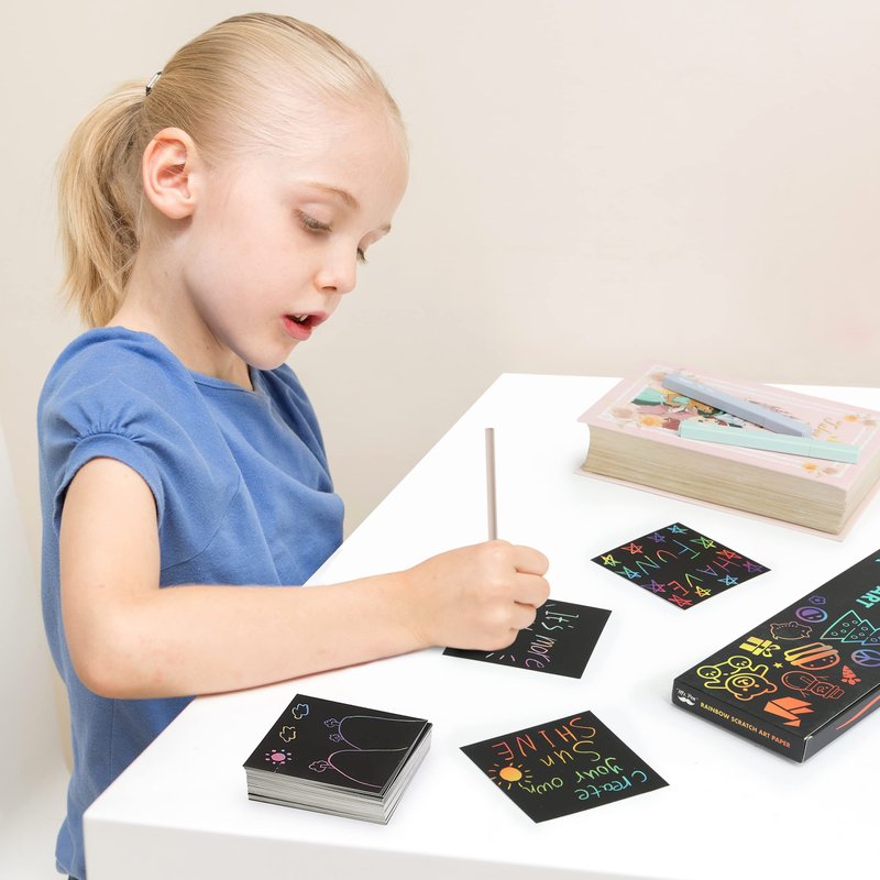- With our scratch paper art for kids, you can give your child hours of fun without worrying about messes or waste. The small sizes also make it easier for them to store away after use and transport around when needed.