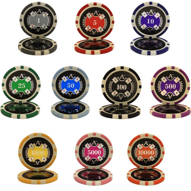 These 14 gram Ace Casino poker chips will bring the look and feel of a casino card room to any home game. These chips are eye-catching as well as classy.