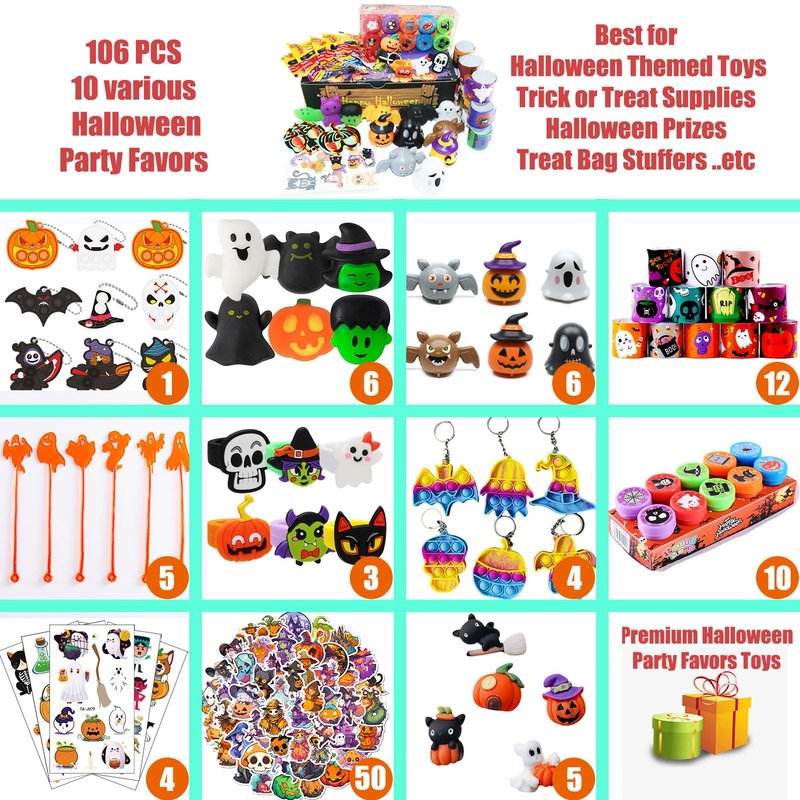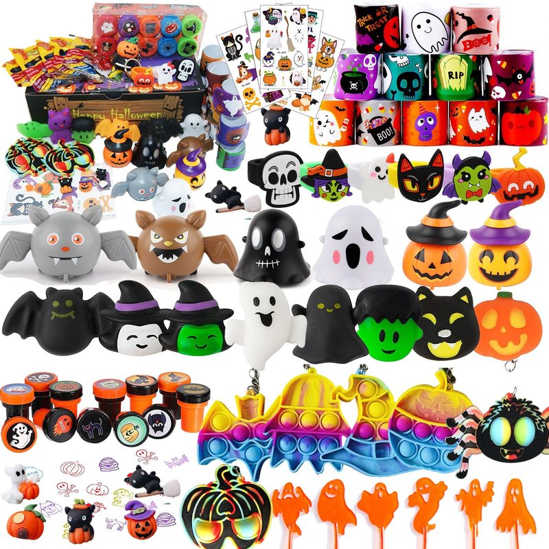 - SUPER VALUE SUPER CUTE PACK for kids. include:6*Halloween theme tattoo stickers ,10*Halloween theme stamps,6*pull back cars,4*pop it keychain,1*Halloween theme keychain,3*cute ring ,12*Slap Bracelets,6*cute Squishy Toy,5*cute Sticky ghost,5*cute resin decoration.
