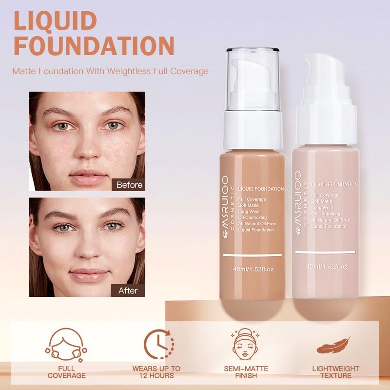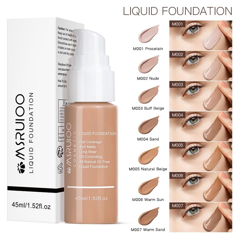 MSRUIOO Liquid Foundation, Matte Finish, Weightless Full Coverage, Oil-Free, Non-Comedogenic, 1.52 fl oz (M002, 1pc)