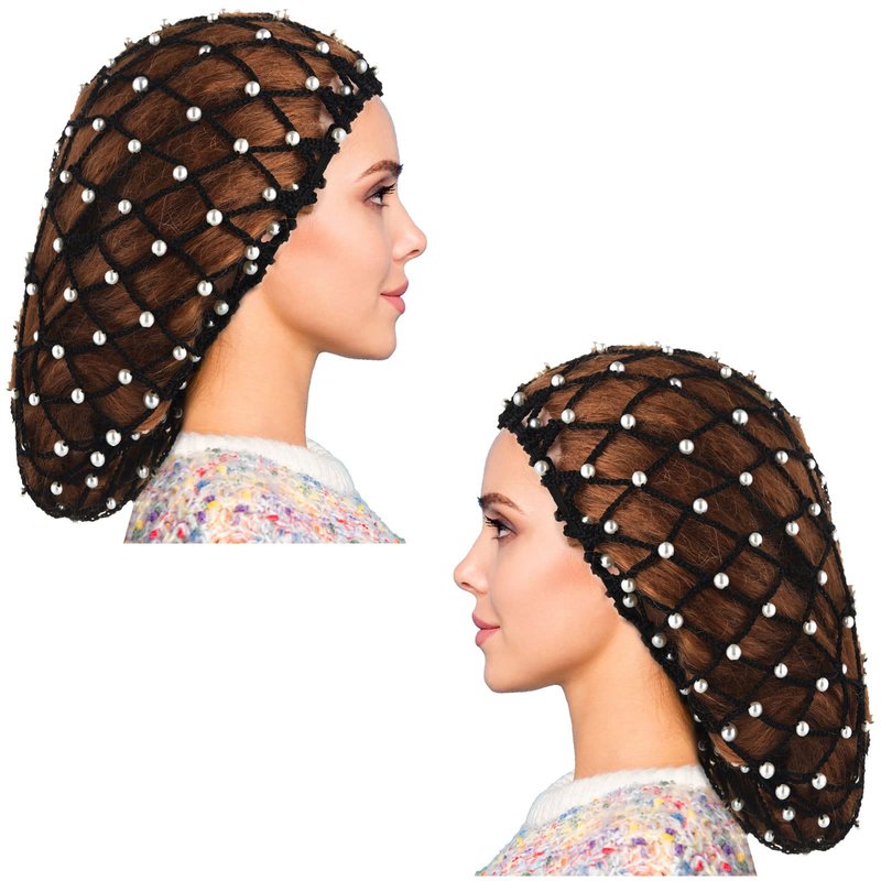 MTLEE 2 Pieces Mesh Crochet Hair Net Rayon Knit Snood with Pearl Crocheted Sleeping Cap Hair Wrap Hair Cover Ornament for Long Short Curls Hair(Black)
