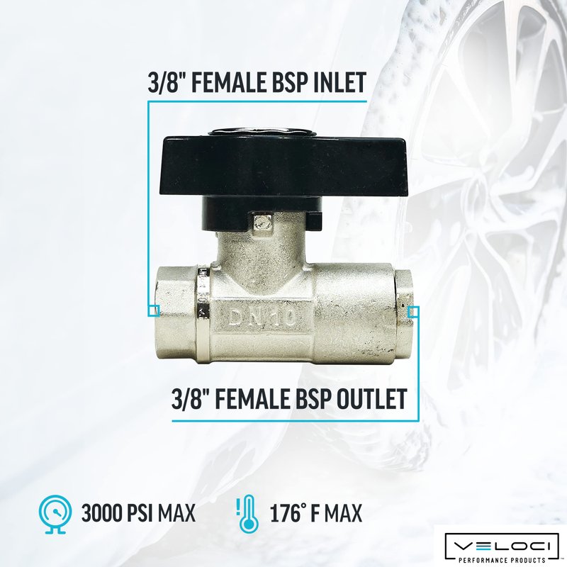 - LIGHTWEIGHT - Pressure washer shut off valve made from lightweight materials with a rounded frame. 3/8" Female BSP Inlet x 3/8" Female BSP Outlet.