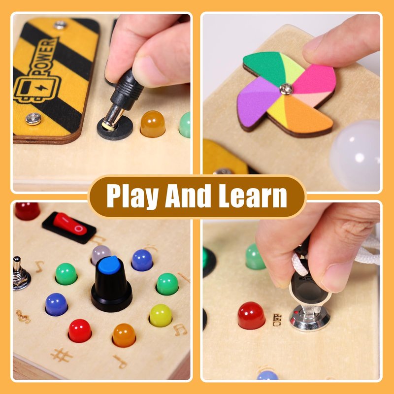 - Toddler Montessori Busy Board -This busy board is designed for toddlers who love switches and LED lights. This busy board is set with 10 different switches, each corresponding to a different color or style of LED light. The brightness of each LED is adjusted to be suitable for your baby, not too bright, too harsh or too dark to see.The board also comes with a mirror to keep your child occupied throughout the journey