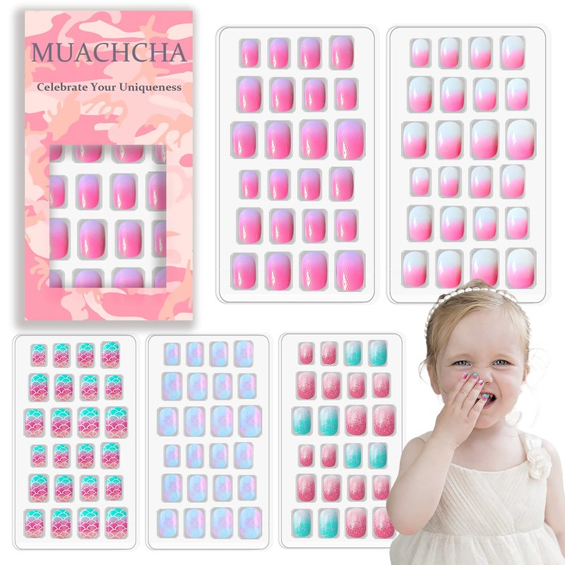 MUACHCHA 120 Pcs 5 Pack Children Acrylic Glitter False Nails Press on Nails Pre-glue Full Cover Fake Nail Tips Stick Cute Cartoon Short Artificial Fingernails for Little Girls Kids Lovely Art