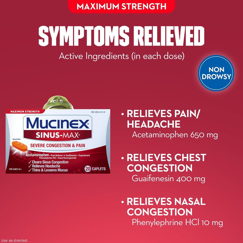 - MAXIMUM STRENGTH RELIEF: Maximum Strength Mucinex Sinus-Max Severe Congestion & Pain helps relieve pain, headache, nasal congestion, sinus congestion and chest congestion.