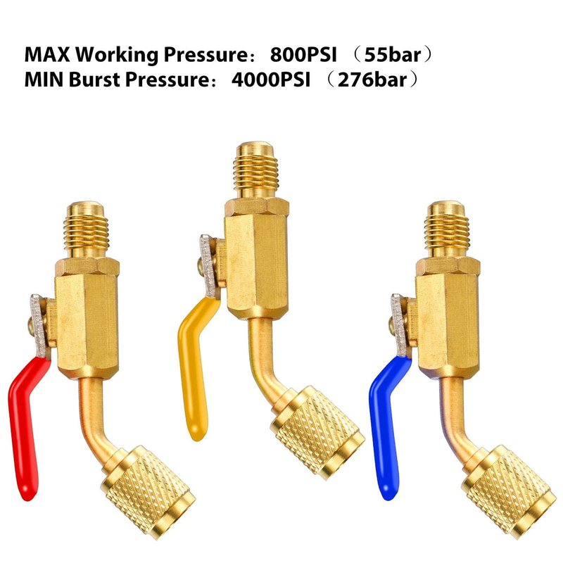 "7 Pieces air conditioning refrigerant ball valve set includes 3 pieces angled compact ball valve and 4 pieces adapter for mini split systemCompatible with: R410A, R134A, R12, R22, R502, HVAC refrigeration charging hosesAngled compact ball valve: Specifications: Size: 4.9 x 3.7 x 0.9 inchesWeight: 10.7 ouncesMaterial: copper Features: Designed for 1/4 inch refrigerants3 Pieces color coded shut valvesCan be operated with one hand, screws onto charging hose end. Made of solid metal for durable use. Adapter for mini split system: Specification: Size: 3.9 x 2.7 x 0.8 inchesWeight: 2.88 ouncesMaterial: copper Function: converts the 5/16 inch charging-vacuum ports (R410a style) to accept 1/4 inch gauge-hose set. Features: 1/4 Inch male x 5/16 inch female adapter. Fits for R410a mini split system air conditioners, HVAC and refrigeration service. The thimble of the connector is protected against fluoride leakage. Made of brass, access valves high tensile strength while resisting corrosion. Easy to operate and install. Package includes: 3 x Angled compact ball valves 4 x Adapter for mini split system"