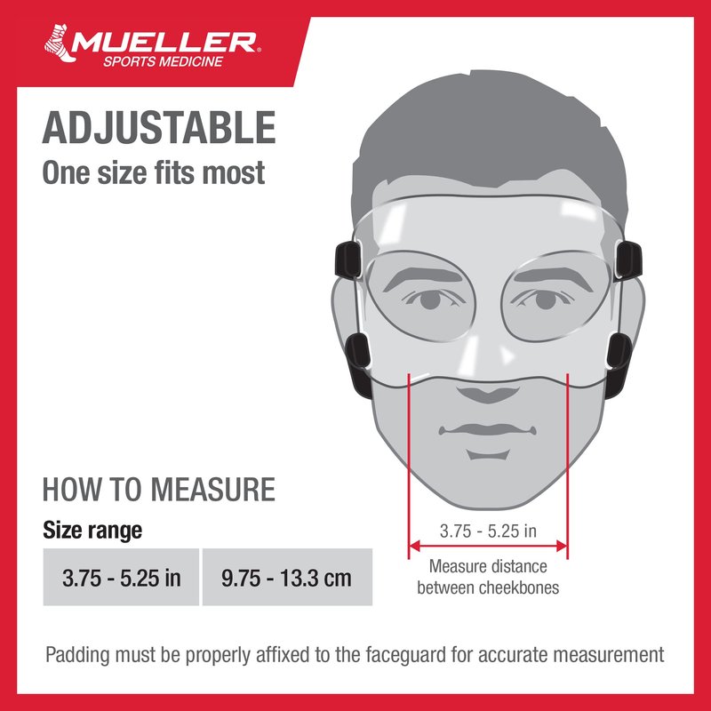 - FIT: One size fits most. For Men and Women. Made of crack/shatterproof medical-grade polycarbonate, the Mueller Face Guard is contoured to fit comfortably and to be less obtrusive