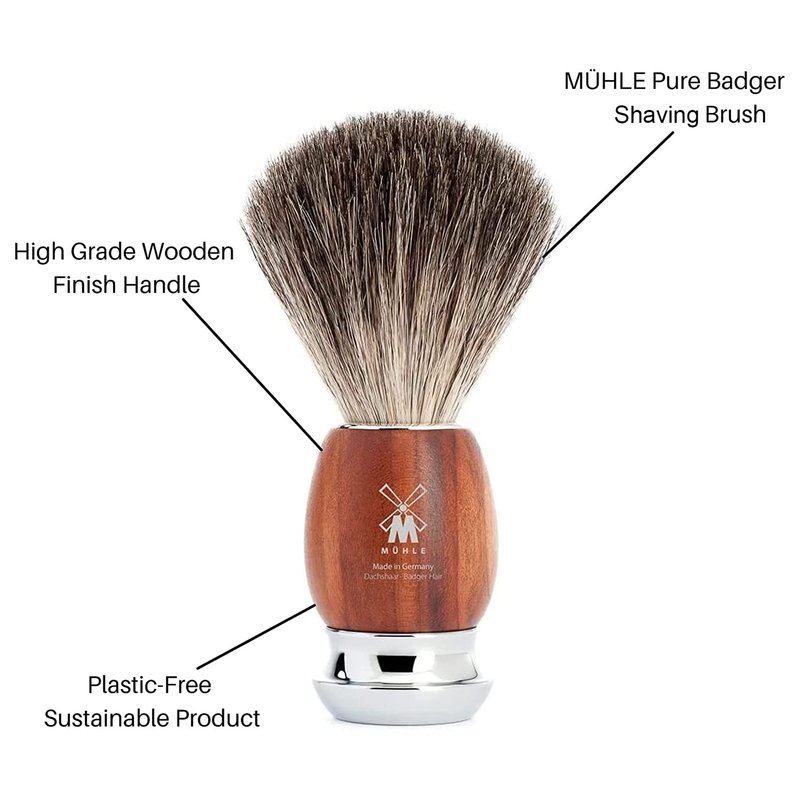 - USE: Wet the brush under warm water. Next, place shaving soap or cream into a bowl or cup and dab your desired amount onto the brush, proceeding to gently work it into a lather on the skin. Use a MÜHLE razor for a clean shave, rinse, and repeat.