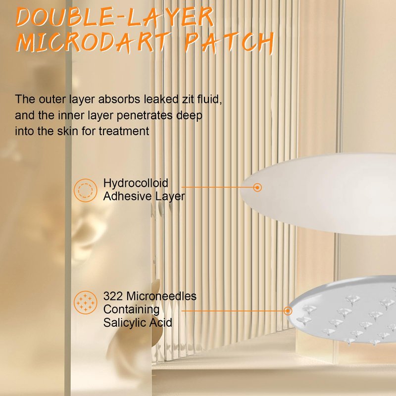 - 322 Microdarts for Deep Acne Treatment: Our microdart acne patch features 322 microdarts that deliver targeted treatment deep into the skin. The outer layer of salicylic acid absorbs acne fluid, while the inner microdarts can penetrate deep into the skin to treat acne.