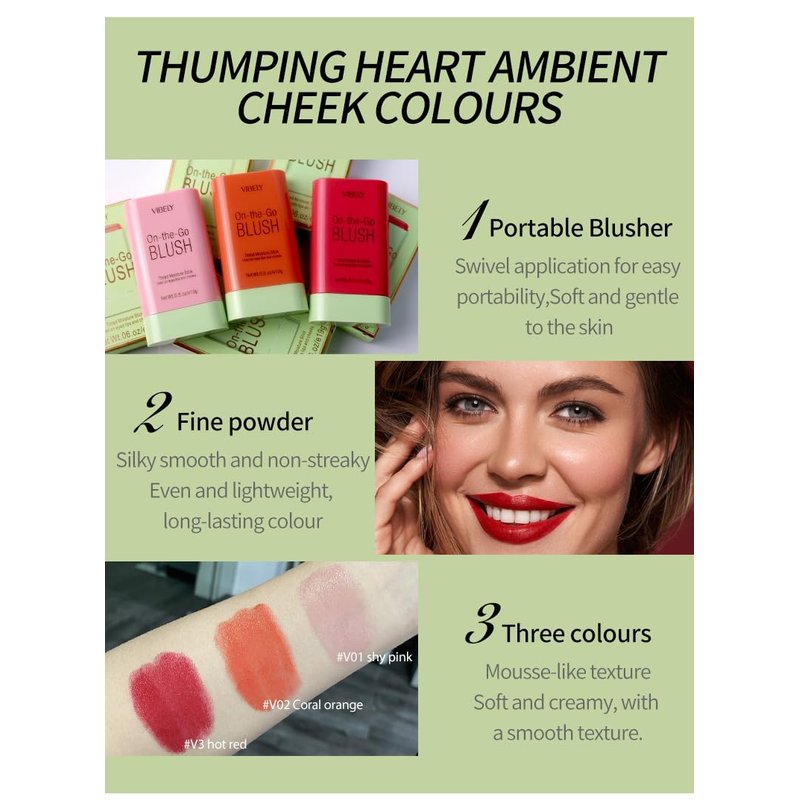 - 3-in-1 Cream Stick --- Cream blush stick can be gently applied to the skin, can be used as eye shadow, lipstick, blush three cosmetics. Just blend colors with your fingertips to achieve a natural, perfect matte look.