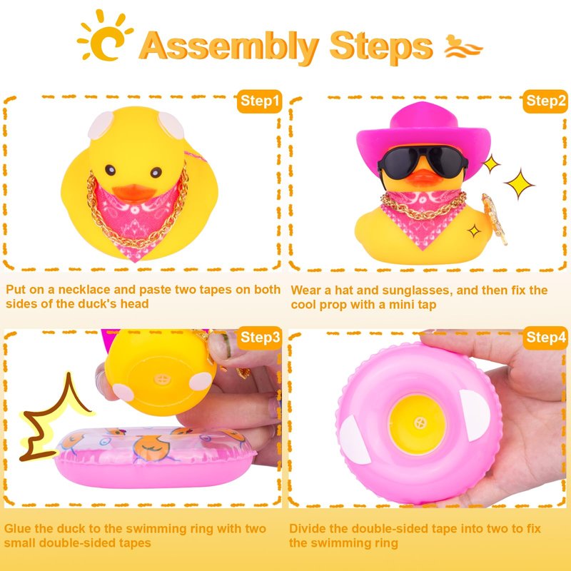 - 🐤 FUN OF DIY: You can dress the duck up as you like. Or, you can assemble it according to the following steps: wear the necklace, scarf, and a pair of glasses, stick the hat on the duck's head with mini tapes, fix the duck to the swim ring with double-sided tapes, and stick the swim ring where you want to put it.