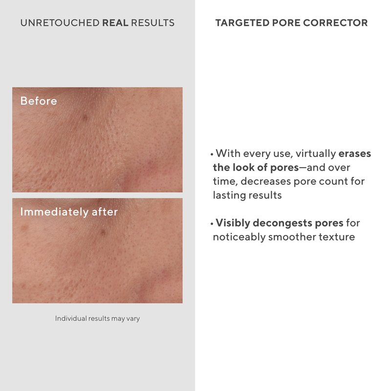- TARGETED PORE CORRECTOR: Bio-tech treatment virtually erases the look of pores with every use—and decreases pore count over time (when applied properly by gently tapping onto pores); for balanced, oily, dry, and combination skin types