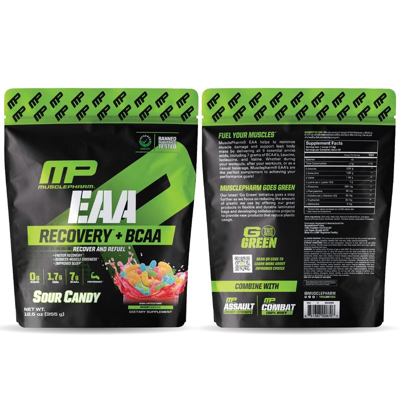 MusclePharm EAA Recovery + BCAAs is a powerful pre and post-workout essential amino acids powder designed to support muscle recovery and fuel your body for optimal performance. This premium energy supplement contains a potent blend of essential amino acids (EAAs) with L-Lysine, L-Threonine, L-Phenylalanine, L-methionine, L-Histidine, and L-Tryptophan, as well as the branched chain amino acids (BCAAs), L-Leucine, L-Isoleucine and L-Valine. With its delicious Sour Candy flavor, this preworkout for men and women not only supports your fitness goals but also provides a refreshing taste experience. This convenient and easily mixable EAA powder in mouthwatering Sour Candy flavor ensures that you're consistently motivated to take your fitness journey to the next level. Whether you choose to consume it as pre workout energy booster, post workout recovery drink, during your exercise, or casually, it's always a delight for your taste buds. MusclePharms muscle building supplements for men and women are banned-substance tested and certified by Informed-Choice, so you can enjoy with confidence. Our workout supplements and energy powders are manufactured in a Good Manufacturing Practice (GMP) compliant facility, ensuring the highest standards of quality and purity. With MusclePharm EAA Recovery + BCAAs, you're not just getting an amino acid supplement; you're investing in your fitness journey. Crush your workouts, recover like a pro, and reach your fitness goals with ease. #WELIVETHIS