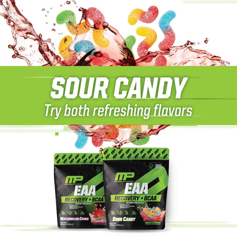 MusclePharm EAA Recovery + BCAAs, Post Workout Essential Amino Acids Powder, Pre Workout Energy Supplement for Men & Women with Branched Chain Amino Acids, 30 Servings (Sour Candy)