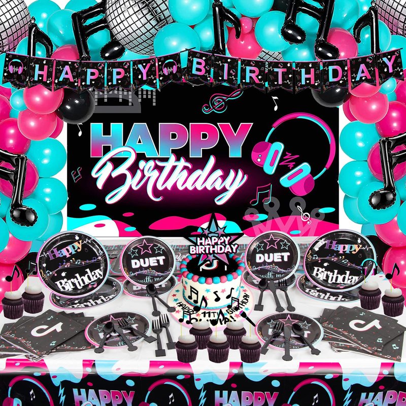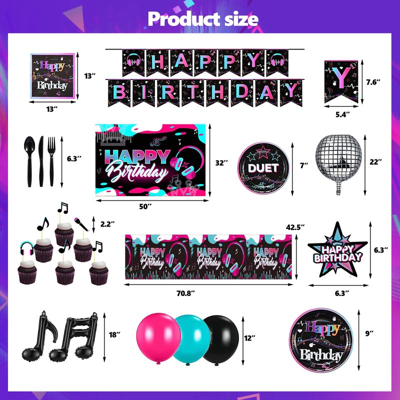 - 📦The Music Party Pack is enough to hold a beautiful music party, includes: 1*Music Birthday Banner, 48*Balloons, 1*Music Background, 1*Cake Topper, 24*Cupcake Toppers, 4*Music Note Balloons, 3*Disco Balloon, 1*tablecloth, 10*knives, 10*forks, 10*spoons, 10*7 inch plates, 10*9 inch plates, 20*Napkins.