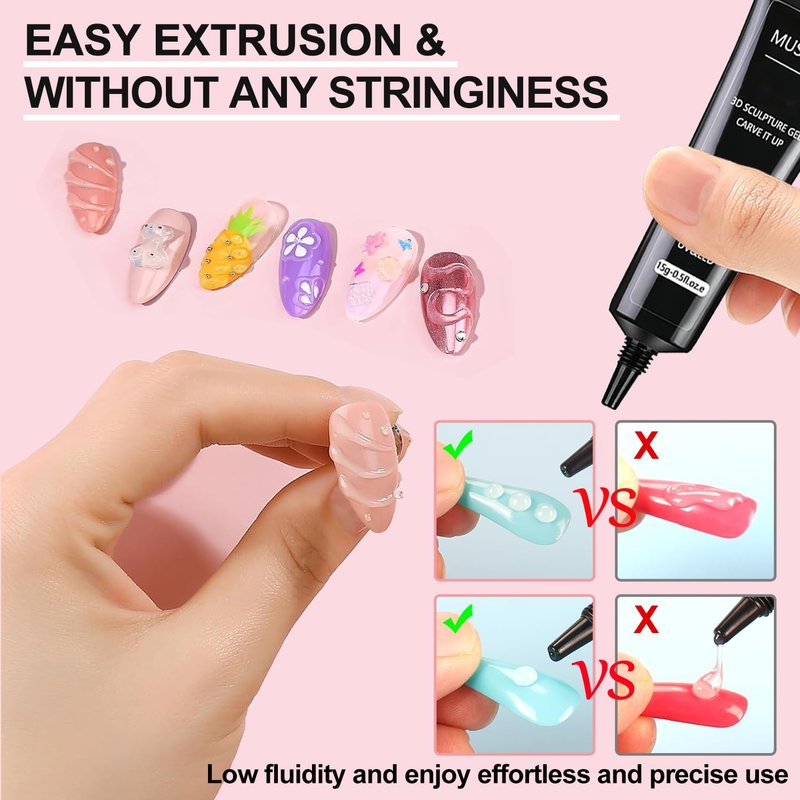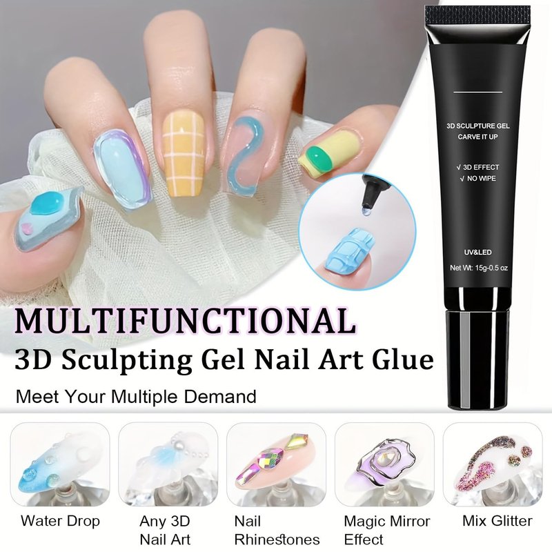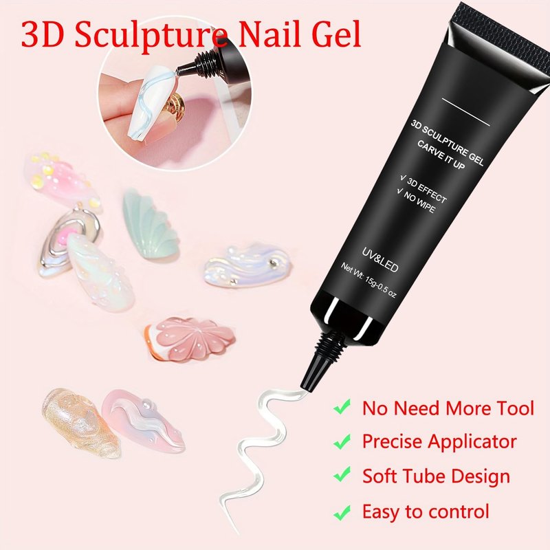 - 【Easy To Carving Nail Pattern & Beginner-Friendly】This Clear 3D sculpture gel is used in nail art that even beginners to effortlessly create the shapes they want. You don't need any other tools or brushes for apply this 3D gel, just squeeze and create the shape directly.It is easy to control and can be adjusted before curing,ensuring precise and professional results.