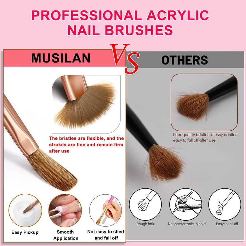 - Premium Quality & Durable : This acrylic nail brush is made of 3A+ high-quality nylon bristles and good gathering properties,offering you a smooth application.The Nail Brush adopts a metal stamping design, which firmly locks the brush head and handle, effectively preventing the hair of the nail brush from falling off and the handle from being damaged, and can be used for a long time and excellent comfort grip will make it to your favorite nail art tool.