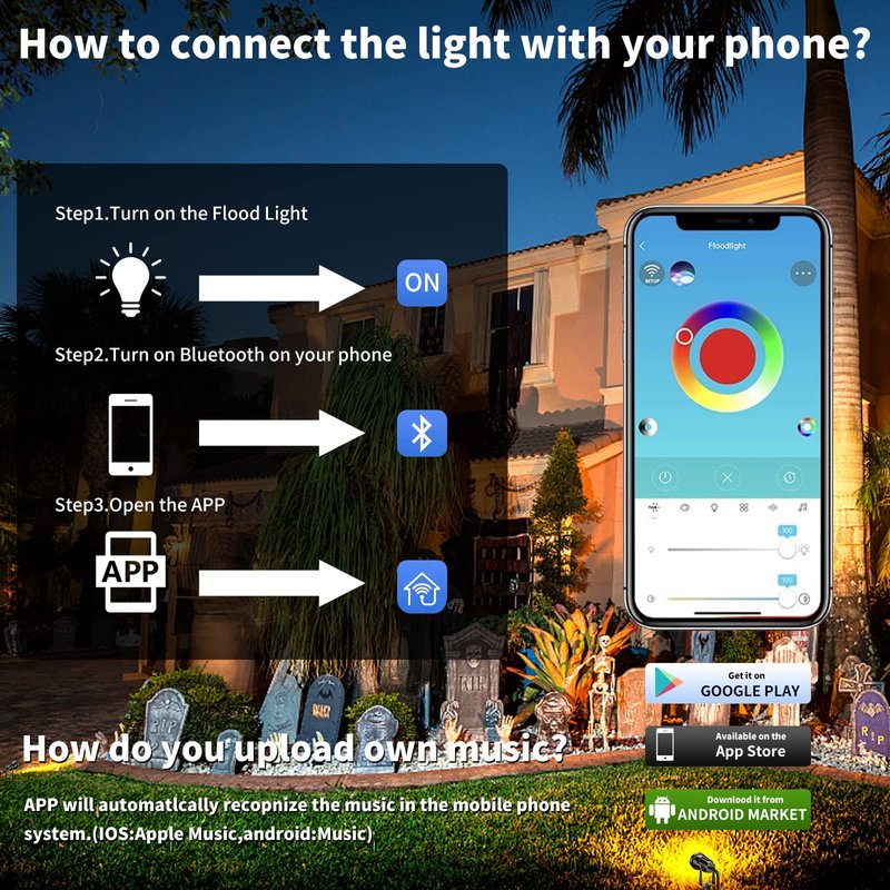 Product Features. ★【Easy to operate】No need to use the gateway, open Bluetooth and scan the QR code on the manual, download the app to Google Play or app Store. then turn on Bluetooth and enter the app to complete the Bluetooth configuration. We use the latest Bluetooth pairing technology up to 65 feet, so you don't need to go out to control these outdoor led spotlights in winter or rainy days. ★[Group Control] All rgb lawn lights can be set up with group control to change colors or modes, so you can control over 100 led landscape lights at once; and the outdoor spotlight has an IP rating of 66; the lawn light can operate in temperatures from -25°C to 40°C and withstand severe weather conditions such as heavy rain, sleet or snow. It is an excellent outdoor lighting and perfect decorative lighting for your garden, patio, aisle, porch, balcony or driveway, etc. ★[Music Melody Rhythm Mode] Our smart led spotlight can change color according to the rhythm of music melody. We have 16 million colors and 20 patterns, so it can be used for stage lighting, landscape lighting, background lighting, outdoor flashing lights, spotlights; you can use it to decorate Christmas, Halloween, wedding, garden, etc. Application areas: garden, terrace, parking lot, lawn, driveway, garage, front or backyard, etc. Material: space aluminum + tempered glass Working temperature: -13°F-122°F(-25°C-50°C) Protection level: IP66 Waterproof Service life: 50000 hours Bluetooth communication distance: 1-40 Ft Cable length:60 inch Control mode: cell phone Bluetooth APP control Life span: 50000 Hrs