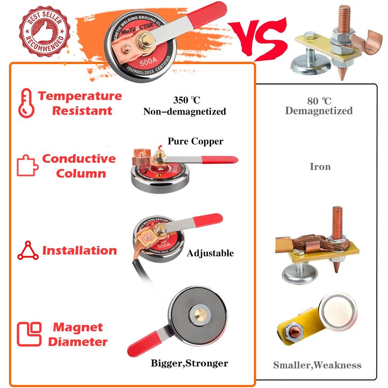 - [High Temperature Resistant and Strong Gripping Power] :Powerful magnetic welding grounds have strong gripping power and magnetically attach to your ferrous metal work surface. Simply secure ground cable over the stud to assure excellent electrical ground. Spring loaded stud keeps constant ground contact.