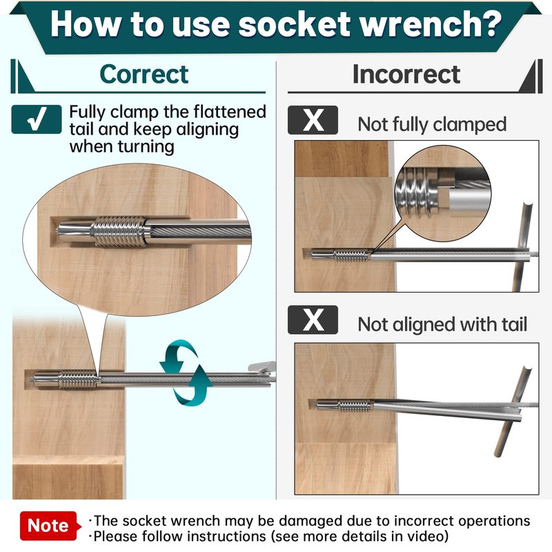 - Patent Design - This custom socket wrench is an essential tool to work with Muzata invisible cable railing kits that are designed with a flattened tail. With patent design of the socket wrench, you can clamp the flattened tail of tensioners and hide the ugly swaged end inside the post. Meanwhile, you can get enough tension to pass the 4” sphere test to meet code compliance. Package includes: 1pc socket wrench
