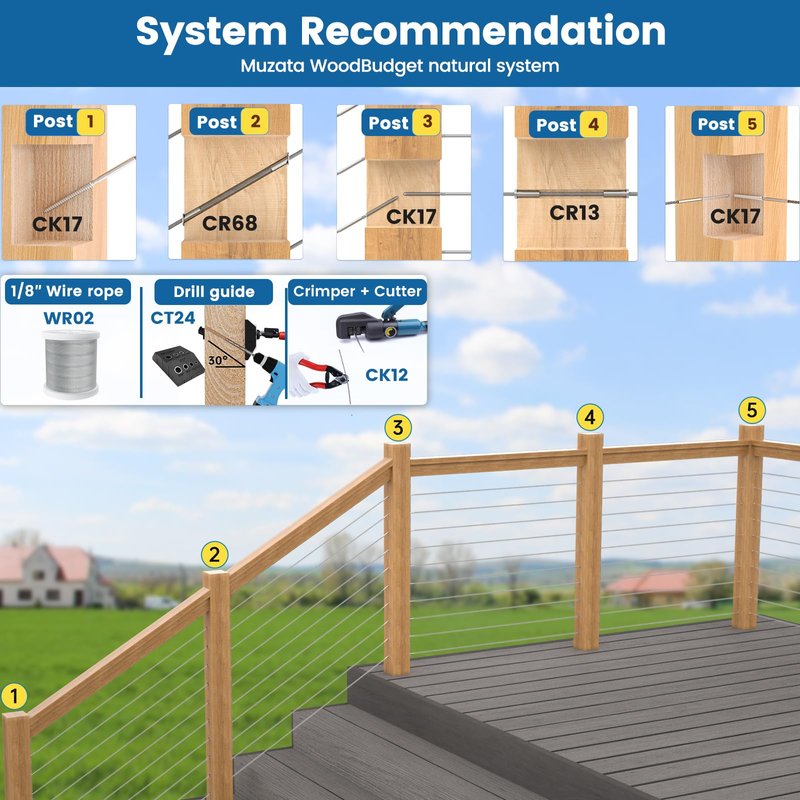 - Advice for constructing a system - To help you build a WoodBudget cable railing system more efficiently, we recommend the following product combinations from Muzata, including 1/8" swage lag screw Muzata CK17, hydraulic crimper and cable cutter MUZATA CK12, drill guide MUZATA CT24, level protector sleeve MUZATA CR13, angled protector sleeve MUZATA CR68,1/8" wire rope MUZATA WR02