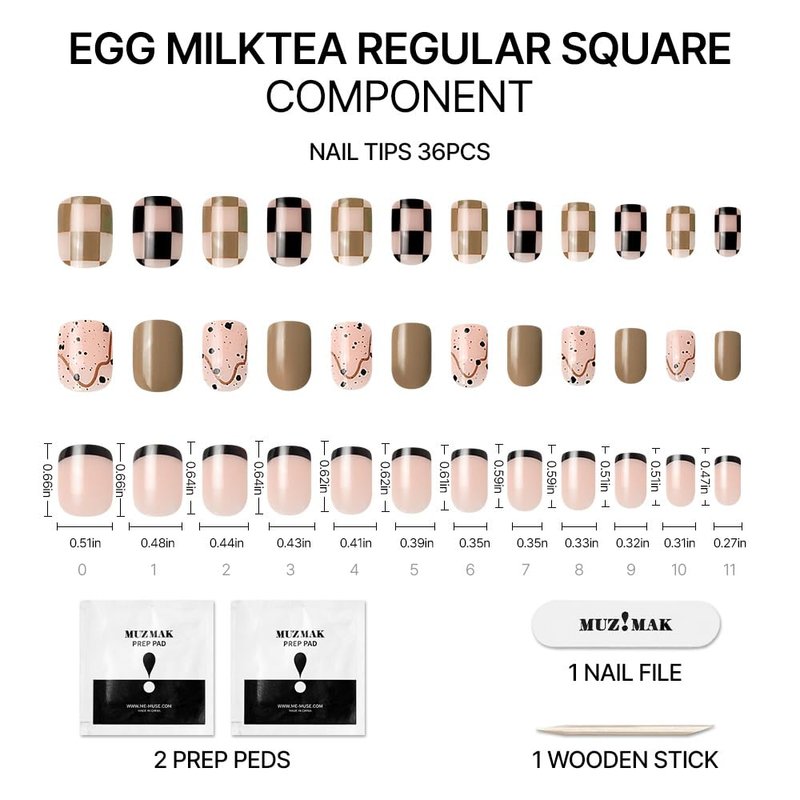 MUZMAK Reusable Press on Nails Long Medium Short Coffin Almond 36Pcs Red Fake Nails Kit Full Cover Pink French Black Kids nail Green (Egg Milktea(Regular Square))