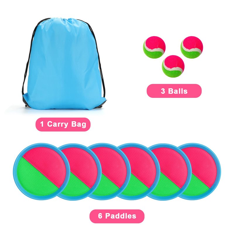 - 1.Classic toy set from the 90s:It comes with 6 paddles and 3 sticky balls with carry bag,fun toys and gifts for indoor and outdoor, 2-6 people can play this toss and catch ball game,kids aged 4-8 especially like this toys ball game set .
