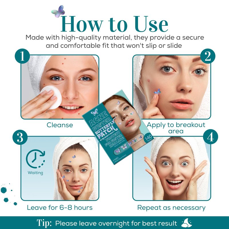 - PROTECT AND HEAL: These acne patches are designed to be a protective covering while treating blemishes, preventing further irritation, and promoting faster healing. Say goodbye to unsightly acne, simply apply to the affected area and watch as they work their magic, clearing up blemishes and leaving your skin looking clear and radiant.