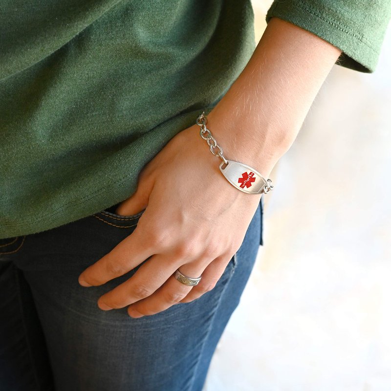 This medical ID bracelet has large O-Links. ID plate is medium in size and is designed for teens & adults with a minimum of 5.25in/13.3cm wrist. May not be suitable for women and teens that want a small medical bracelet. Though at the same time, O-Links are a very popular style for women.