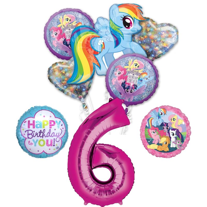 - (1) 34" Giant Pink Number 6 Foil Balloon, (1) 28" My Little Pony Dash Shape Foil Balloon, (2) 18" My Little Pony Friendship Adventure Round Foil Balloons, (1) 18" My Little Pony Group Round Foil Balloon, (1) 18" Pink and Teal Happy Birthday To You Foil Ballopon and (2) 19"Shimmering Holographic Heart Foil Balloons. Inflate balloons same day of event. Ribbon Not Included. All Anagram Licensed Foil Balloons are Made in USA. Founded in 1977, Anagram International leads the world in innovating and manufacturing foil balloons.