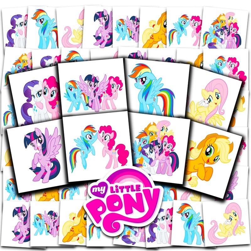 - Package of 70+ individual My Little Pony temporary tattoos, perforated for convenience. Each tattoo measures 2" x 2". These tattoos come in 9 sheets of 8 tattoos.